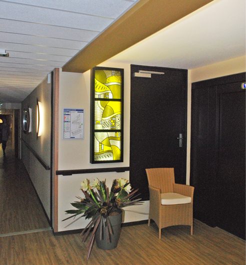 Conception d’une polychromie signalétique inspirée des vitraux en sorties d’ascenseur et rappelée par la mosaique de verre déclinée dans les couloirs sur les 5 niveaux.