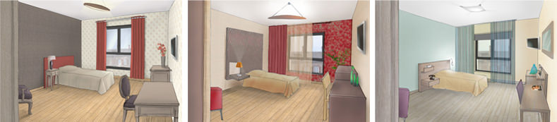 Ce concept de chambre sera déclinée suivant 3 ambiances de couleurs différentes, alternées de façon égale dans tout l’établissement.
