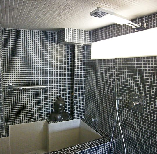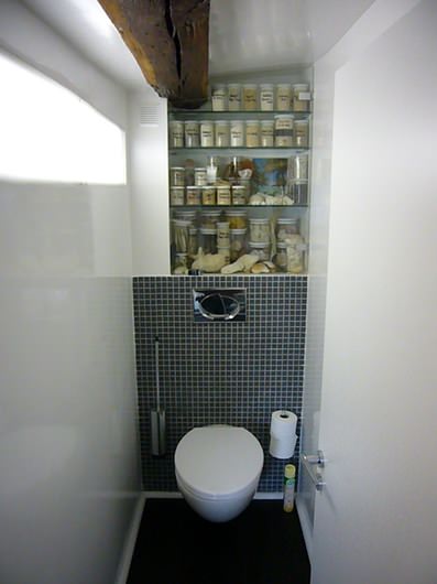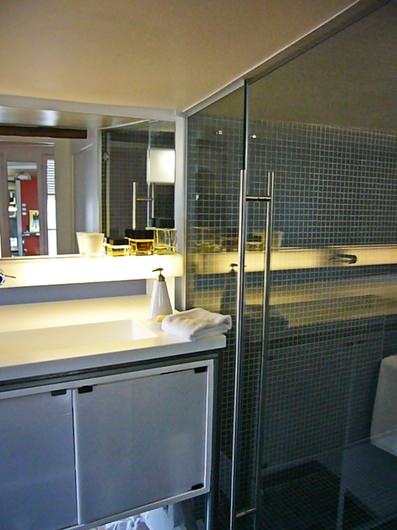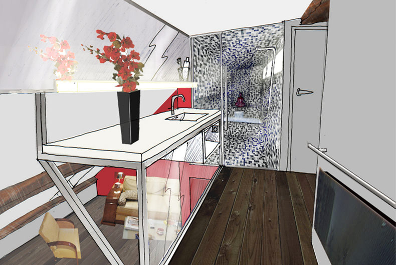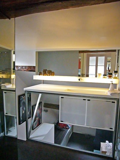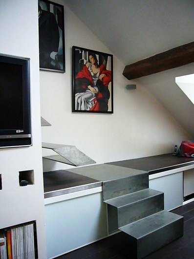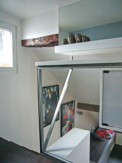 Pour le reste de l’appartement, le travail a consisté à imaginer du mobilier sur-mesure et « 3 en 1 » voire plus pour optimiser chaque cm2 : un escalier pour monter, ranger et même s’asseoir, un plan vasque servant à la toilette, au rangement et même de garde-corps.