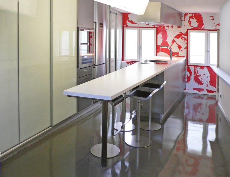 Tout le mur du fond a été doublé de rangements, fermés par des portes en verre laqué. Au milieu, un ilôt de cuisine épuré se prolonge par un plan bar en forme d’aile d’avion. Le long du mur opposé, une console fine permet d’élargir ce bar pour créer une table pour 8 convives.