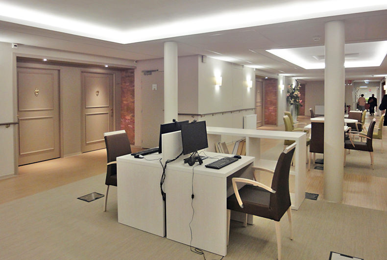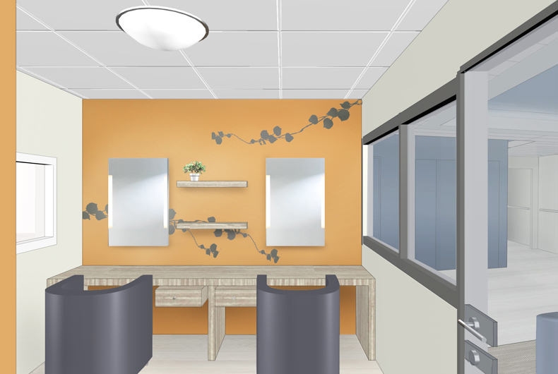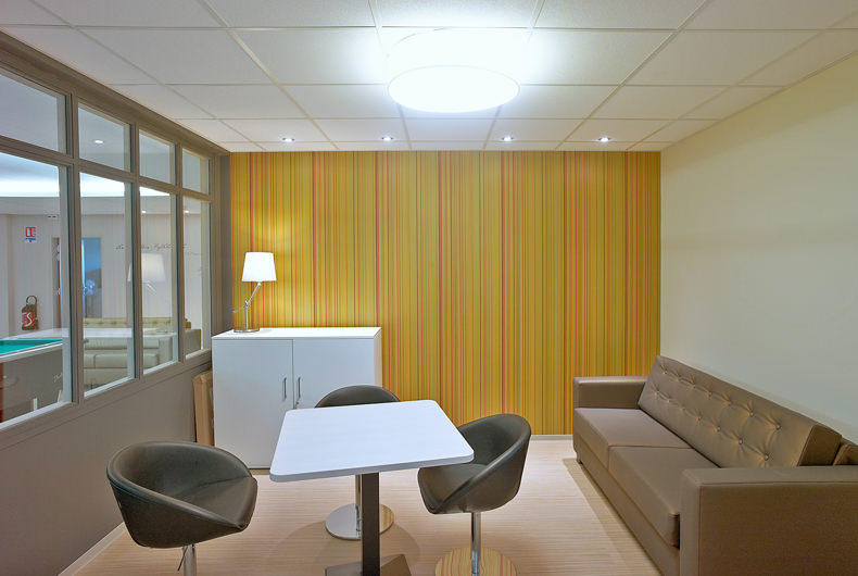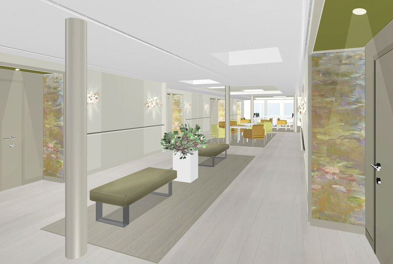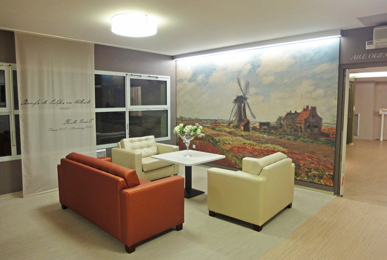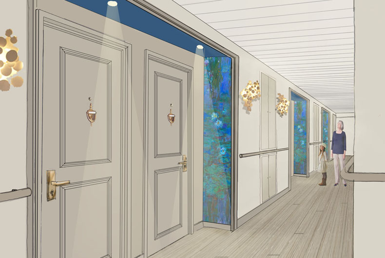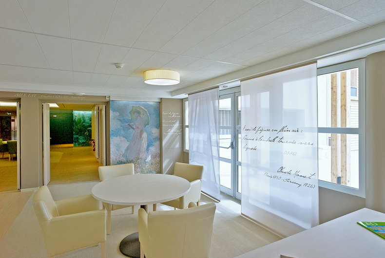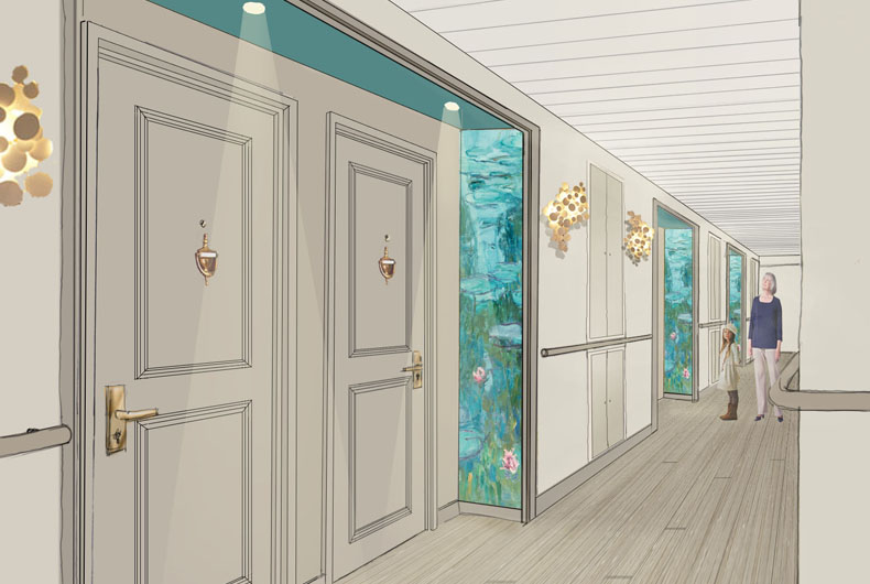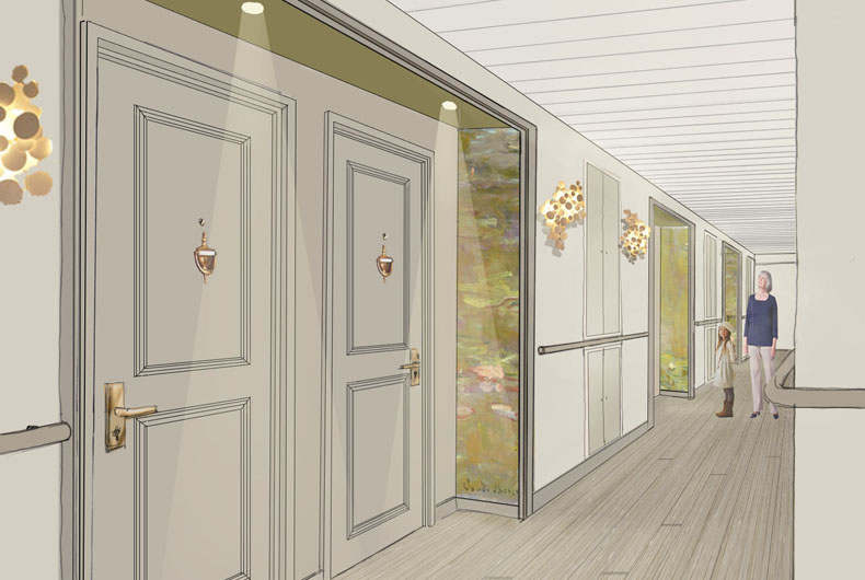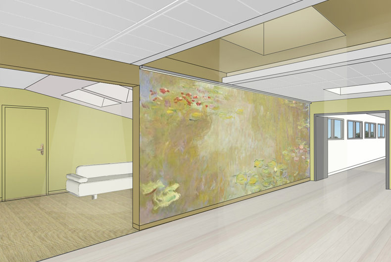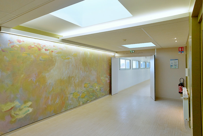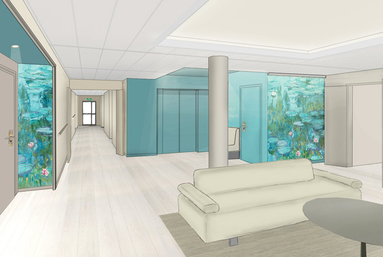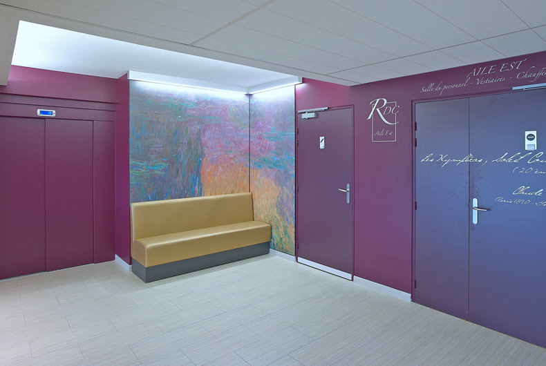Dans chaque alcôve d’entrée de chambre, un extrait de cette toile anime le couloir et rappelle au résident où il se trouve.