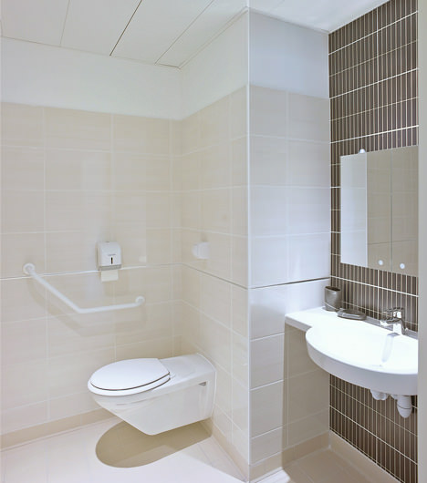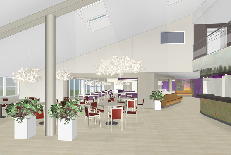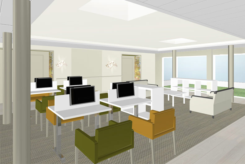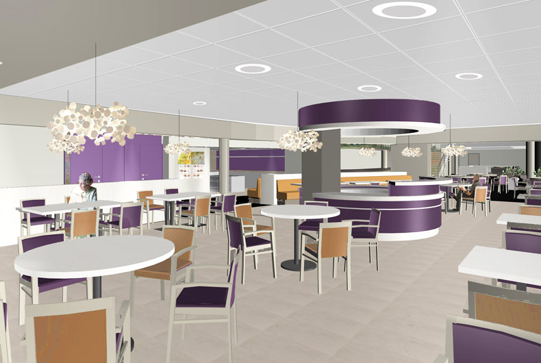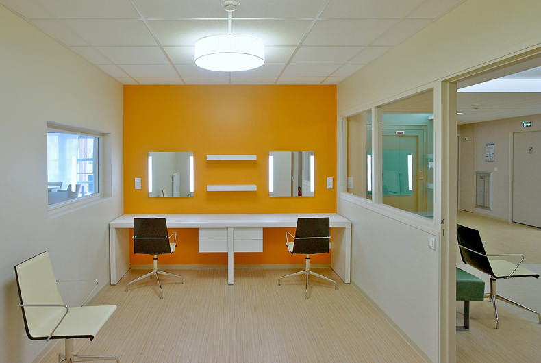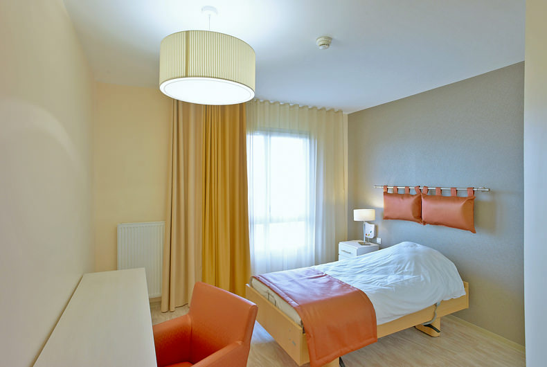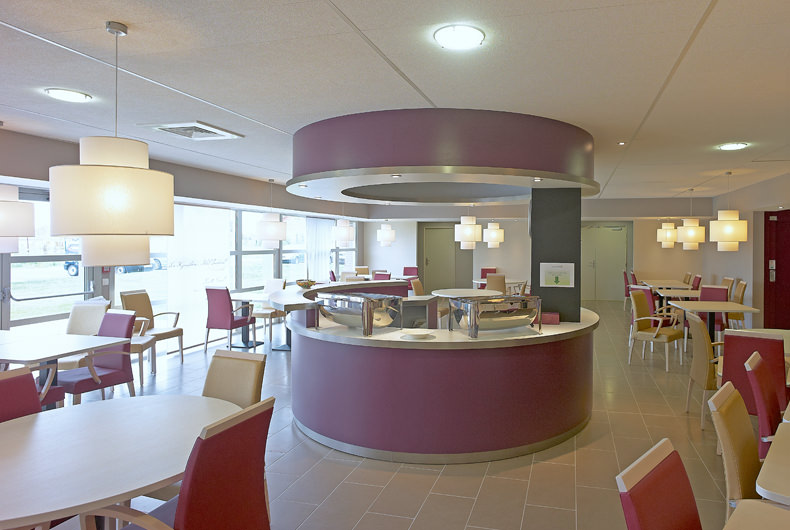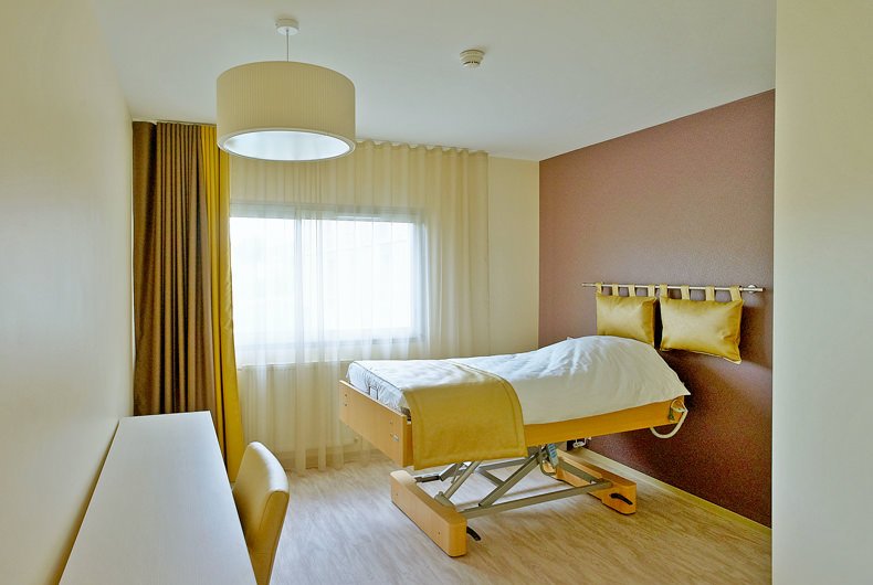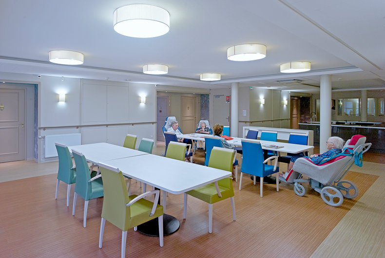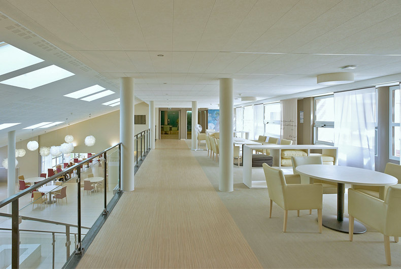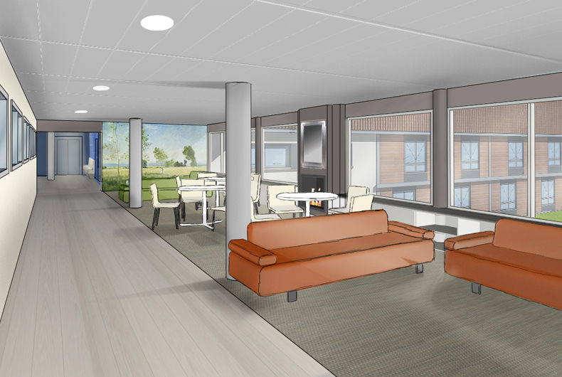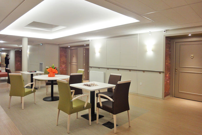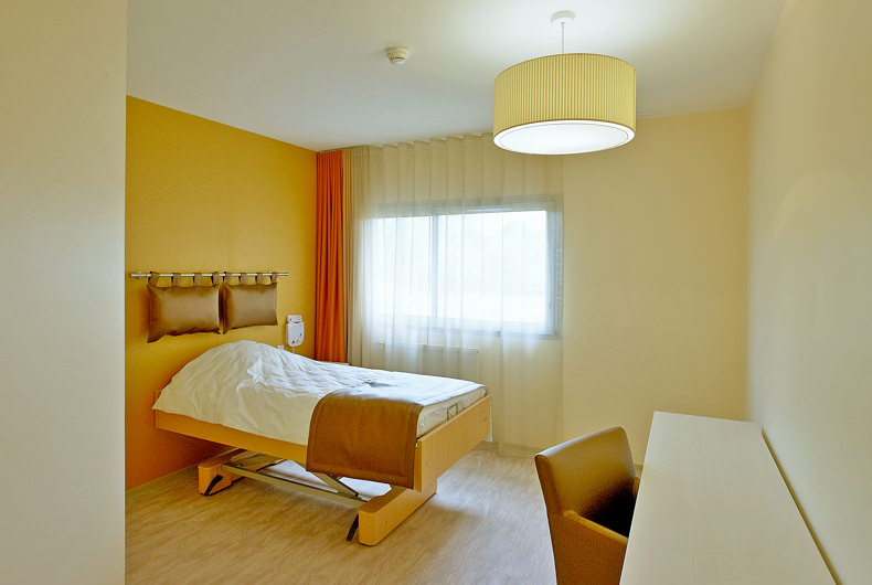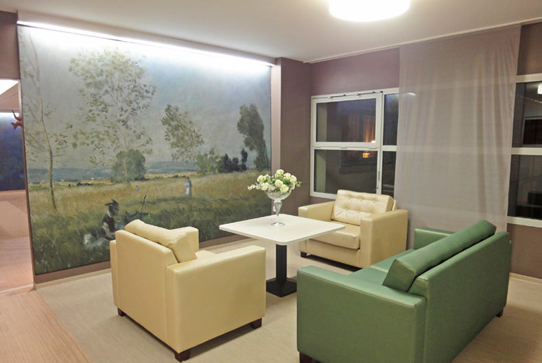 Dans chaque alcôve d’entrée de chambre, un extrait de cette toile anime le couloir et rappelle au résident où il se trouve.