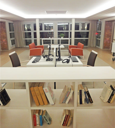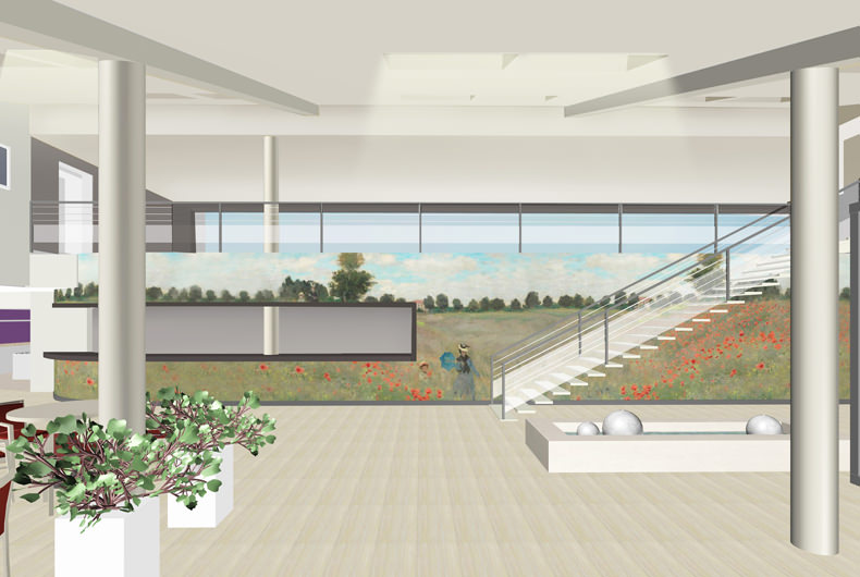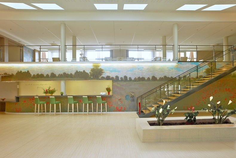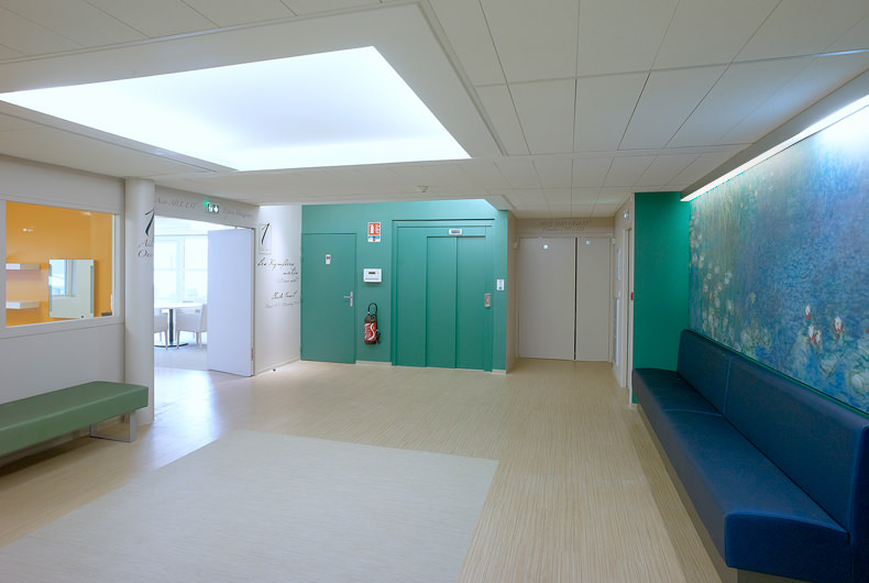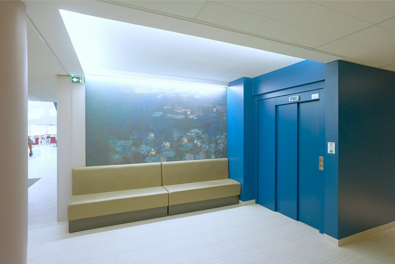 A chaque sortie d’ascenseur, une toile de la série des Nymphéas de Claude Monet donne la couleur dominante de l’étage et de l’aile du bâtiment.
