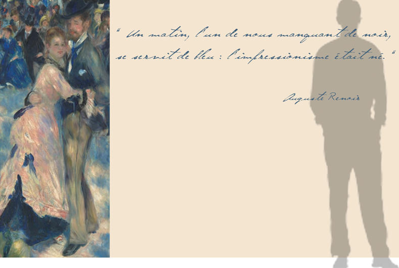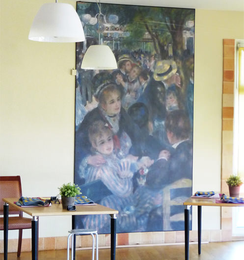 La décoration de la salle de restaurant a été repensée autour d’une toile d’Auguste Renoir, Le Bal du Moulin de la Galette, soulignée par la polychromie des murs et des jeux de zooms et de recadrage dans l’image, comme ce couple de danseurs agrandis pour être à échelle humaine.