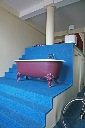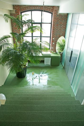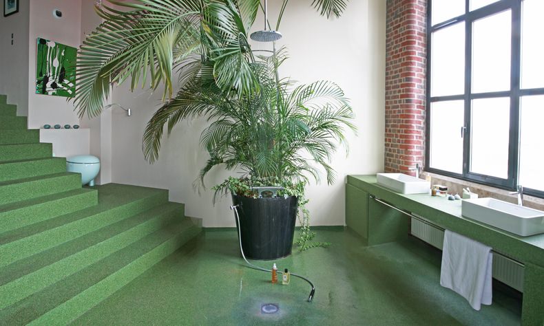 Ainsi, la fonction quotidienne « prendre une douche » se passe en lien avec la chambre et sous un palmier tandis que « se détendre dans un bain » se pratique plutôt le week-end, à l’autre bout de l’appartement côté bureau, et en hauteur pour profiter de la vue.