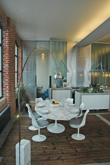 Tout en gardant un grand espace de réception central, très ouvert et dans l’esprit du loft new yorkais ( briques, plancher brut, et grandes hauteurs sous plafond), nous avons fait graviter autour des pièces plus intimes aux fonctions variées.