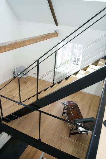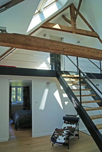 Deux grandes verrières ont été créées sur le versant Sud de la toiture et une partie du plancher du 1er étage a été ouverte pour faire pénétrer cette lumière jusqu’au rez-de-chaussée de la maison.