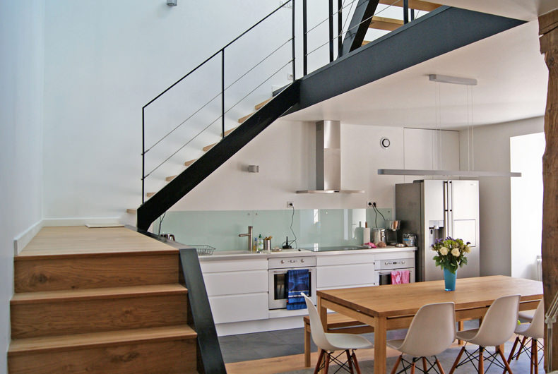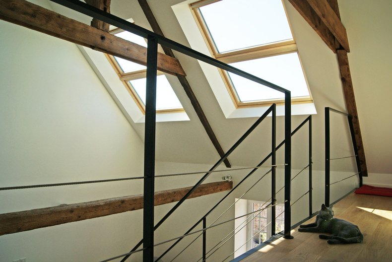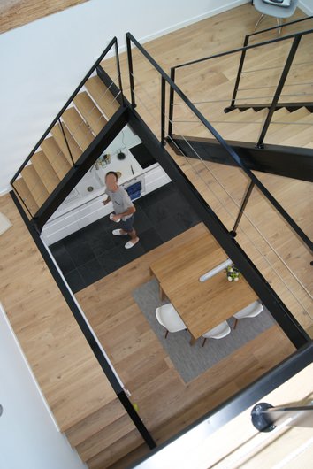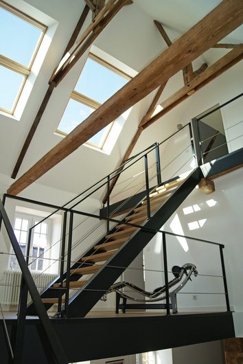 L’ancienne charpente en bois a été laissée apparente et cohabite désormais avec un jeu d’escaliers et de garde-corps fins en acier qui accompagnent le visiteur à travers les différents niveaux de la maison.