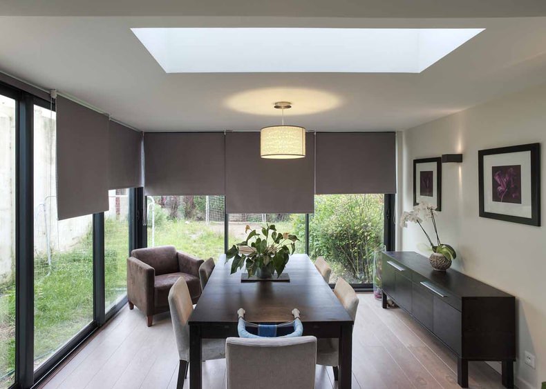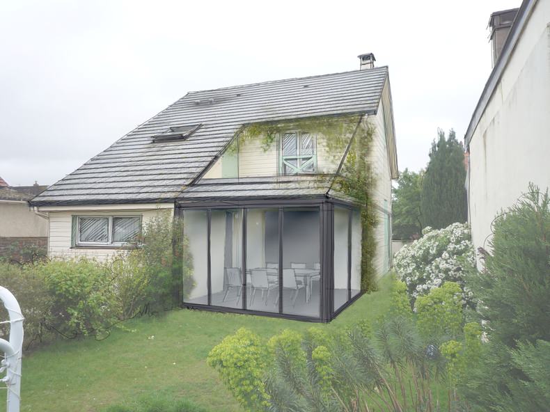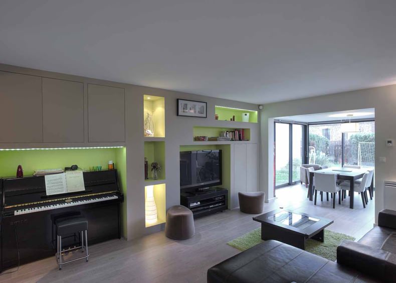 Au Sud, l’extension sur l’avant de la maison a permis de créer une salle à manger lumineuse et libérer de l’espace dans le séjour existant pour créer le bureau des parents, communiquant avec les espaces de vie familiale.
