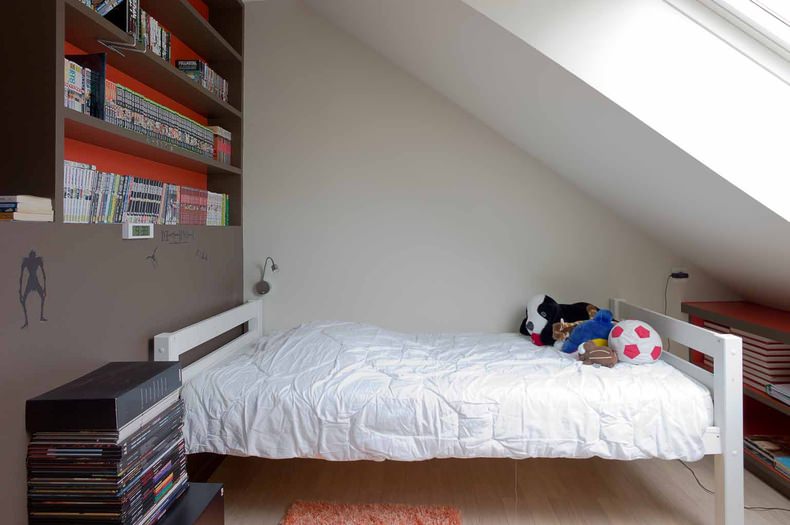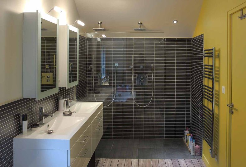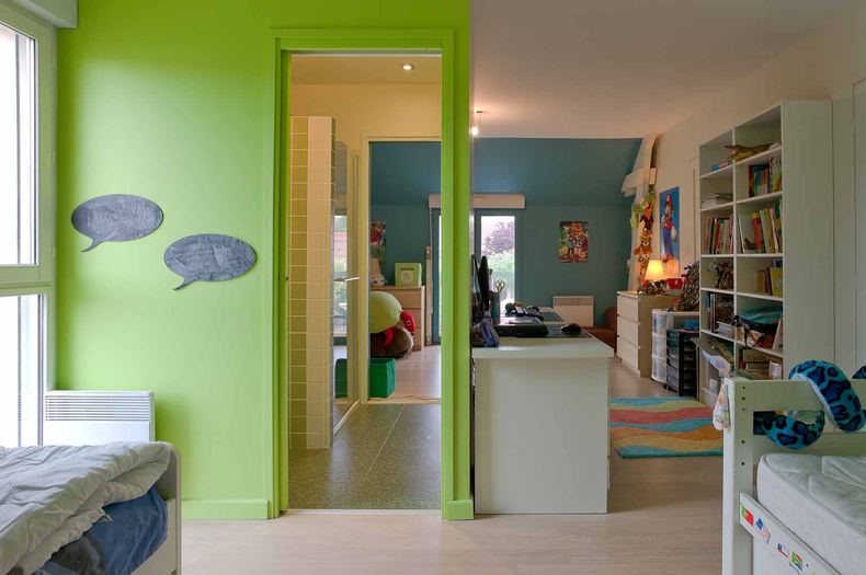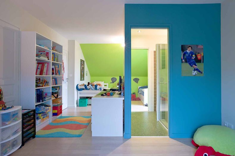 Au Nord, une extension sur l’arrière de la maison a permis de créer une chambre parentale avec dressing et une grande salle de bain familiale. L’étage, une fois libéré de la chambre parents, a pu être complètement dédié aux enfants, avec chacun sa chambre.