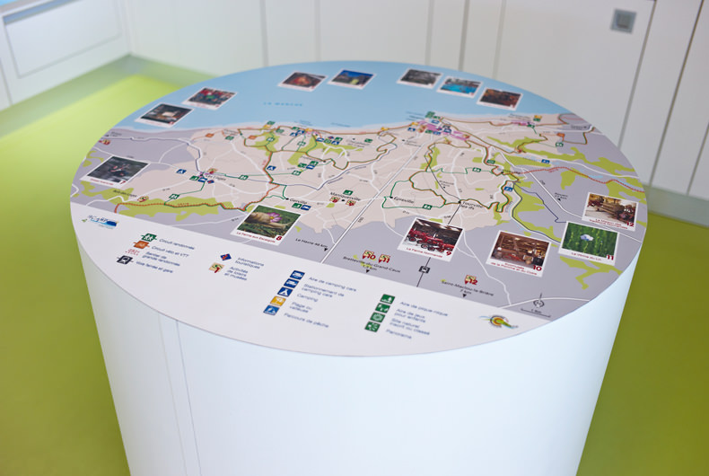 Un important travail graphique à travers des dessins adhésifs stylisés et de nombreuses photos a permis de mettre en scène les nombreux sites et activités remarquables de la région.