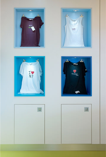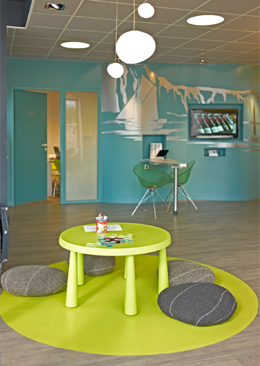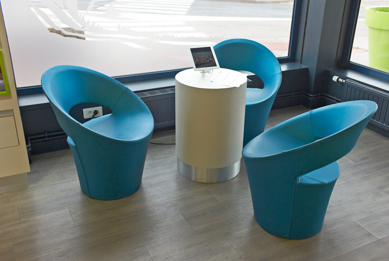Autour sont réparties les différentes fonctions dans des espaces clairement identifiés : la boutique, la zone informations, l’espace consultation des Ipads, le coin enfants et sont clairement identifiés.