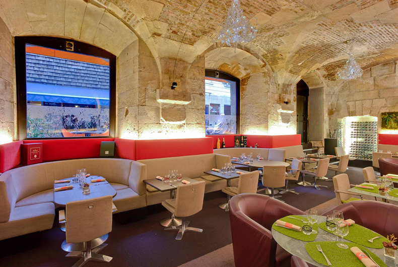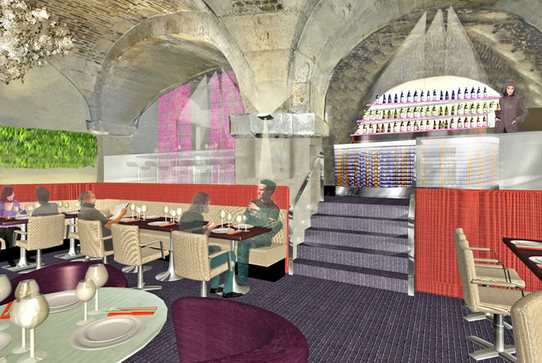 Tout en respectant le cadre historique des lieux, Pierre Guéret souhaitait donner une nouvelle identité plus actuelle à ce restaurant installé sous les voûtes des fondations de ce qui aurait dû être l’Hôtel de Ville de Rouen.