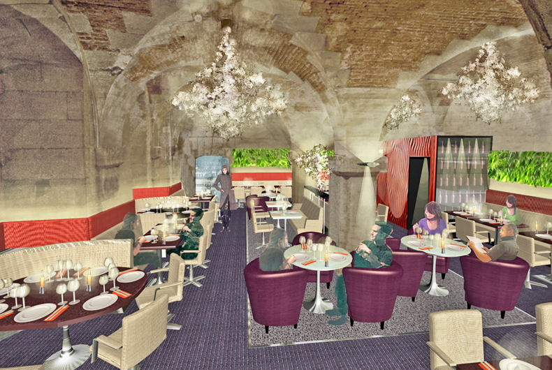L’éclairage général se fait de façon indirect par projection sur les voûtes ou en lèche-murs derrière les banquettes pour mettre en valeur l’architecture des lieux.