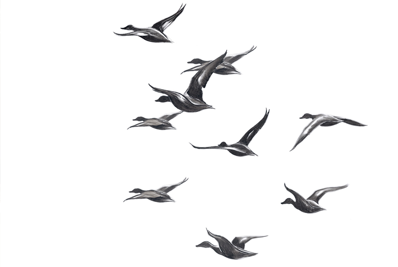 La coupole historique a été conservée mais simplifiée dans sa structure bois et nous avons esquissé une envolée de canards en noir et blanc.