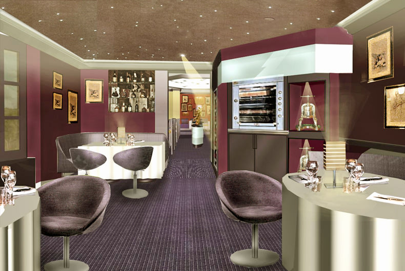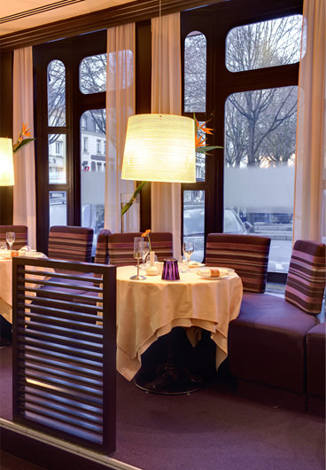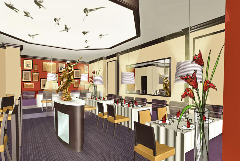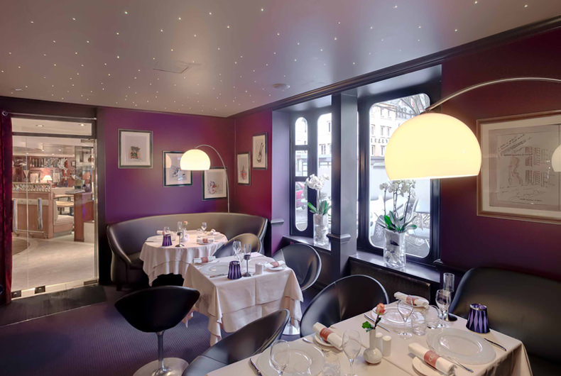 Le salon d’entrée propose une ambiance plus feutrée avec ses murs lie de vin et son ciel étoilé. Cet espace accueille désormais une rôtissoire moderne accompagnée de ses presses en argent afin d’attirer les regards dès l’entrée dans l’hôtel.