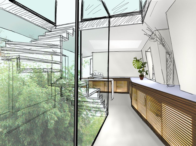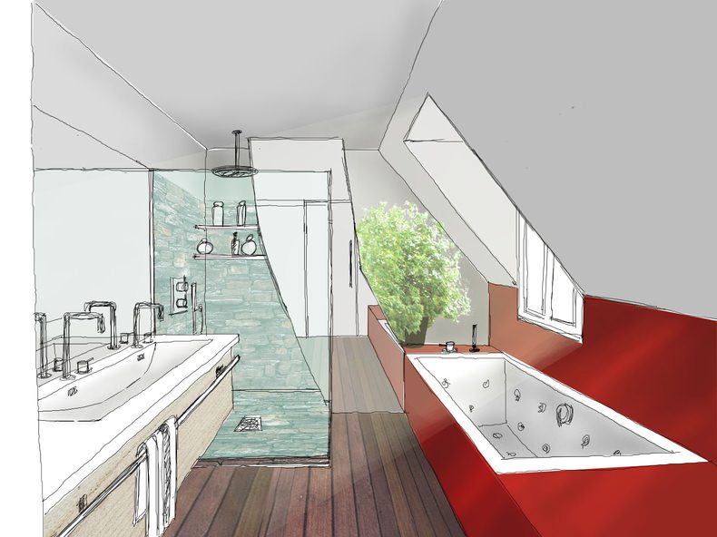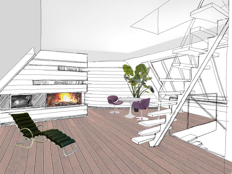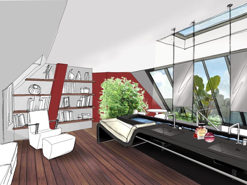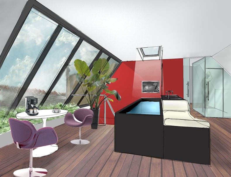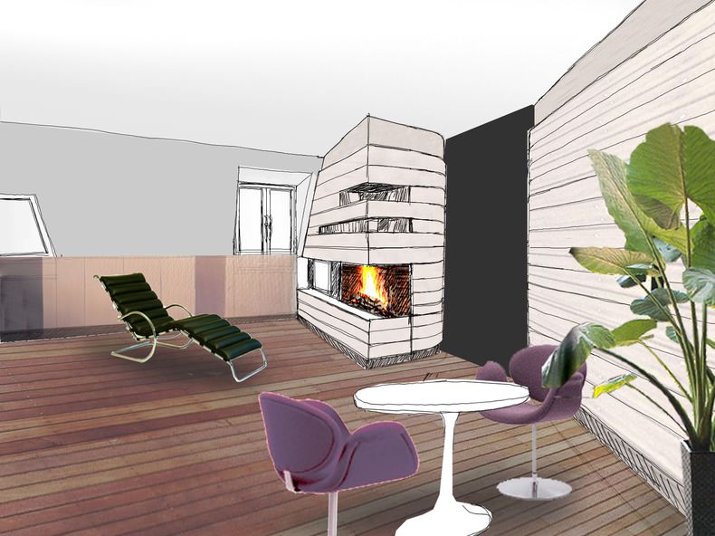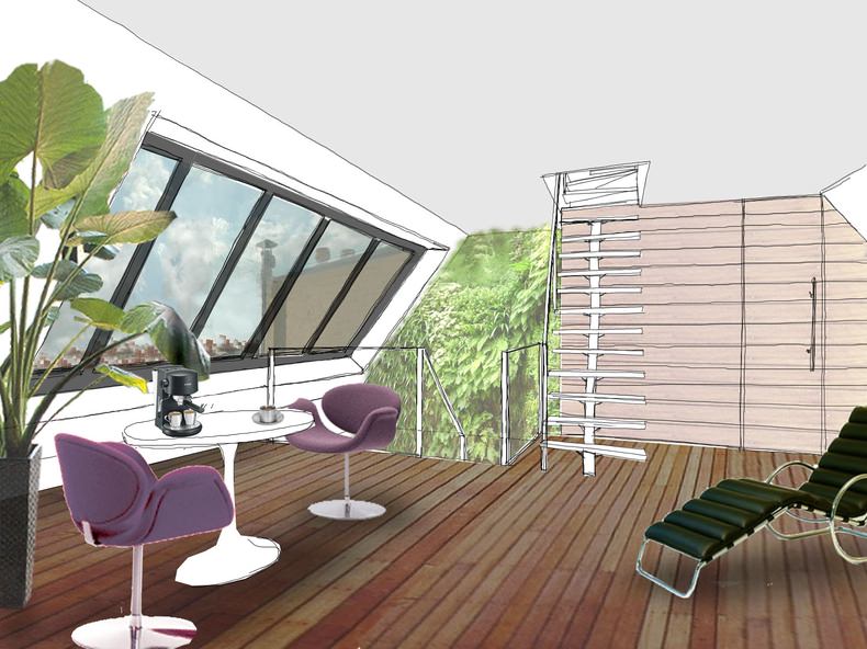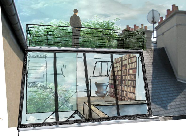 Après avoir fait le deuil d’un projet de terrasse sur le toit (refusée par la Mairie), nous avons échaffaudé ensemble plusieurs hypothèses de « salon » sous une grande verrière en acier : salon de lecture, coin cheminée, espace bain et bien-être, et même jardin intérieur.