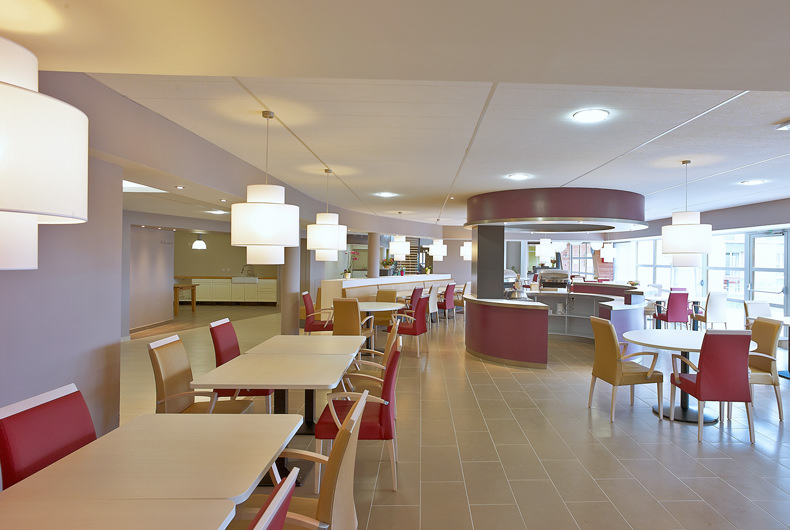 Celui-ci accueille quotidiennement 72 résidents autour de la console du chef, meuble rond central conçu sur-mesure pour permettre au chef de dresser ses assiettes au milieu des convives.