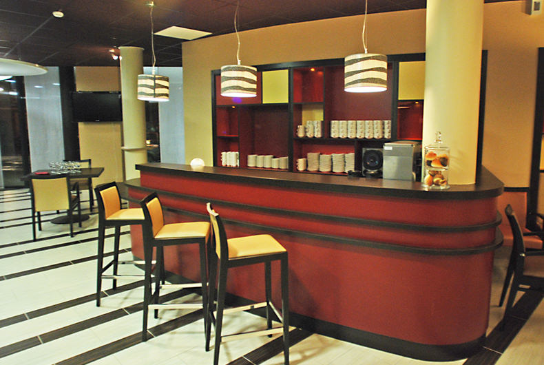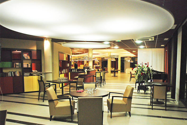 L’espace de vie au rez-de-chaussée regroupe la salle de restaurant, un bar et un salon bibliothèque.